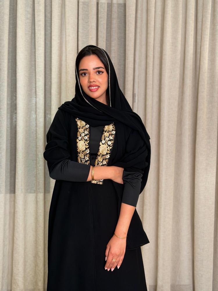 عباية كريب باردة | كم استرتش | كلفة أنيقة مطرزة بالأبيض والذهبي | قصة عادية استريت | مع الطرحة