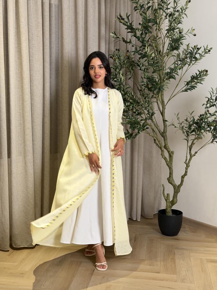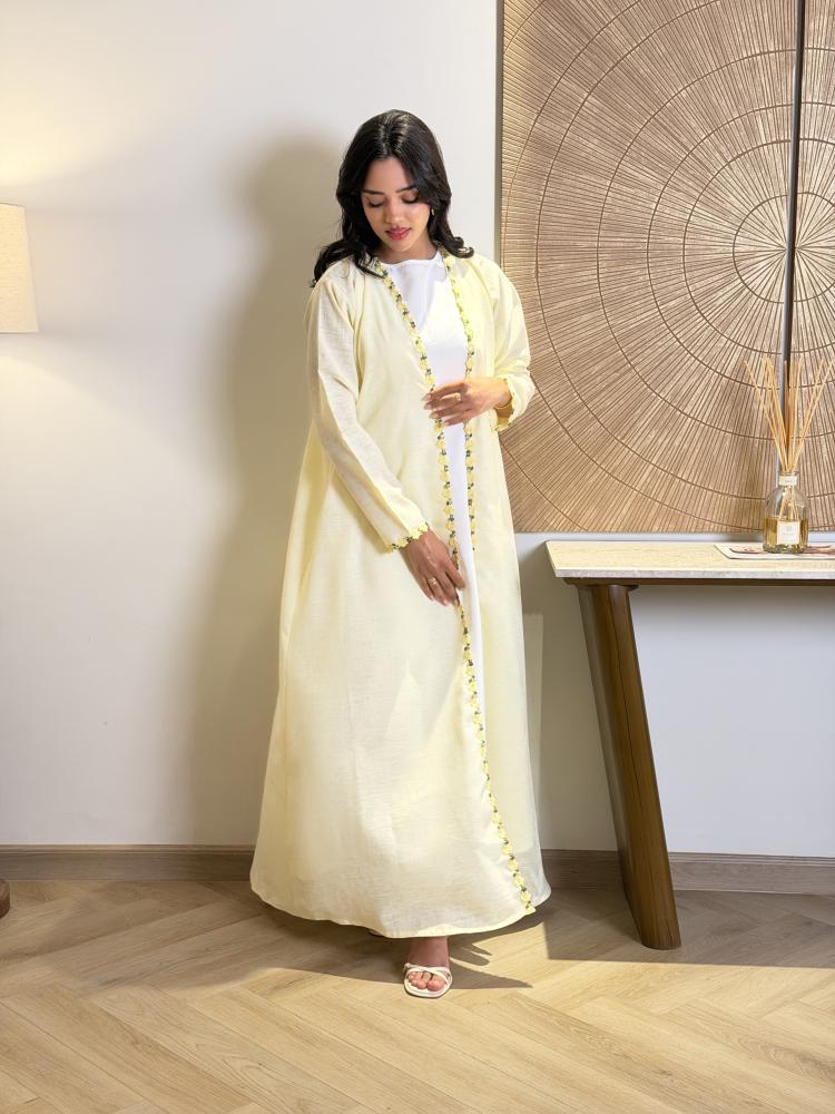 عباية لينن هندي أصفر | كلفة ورود | مع طرحة ليزر طرف الطرحة مزخرف بالورود | قصة ربع كلوش |