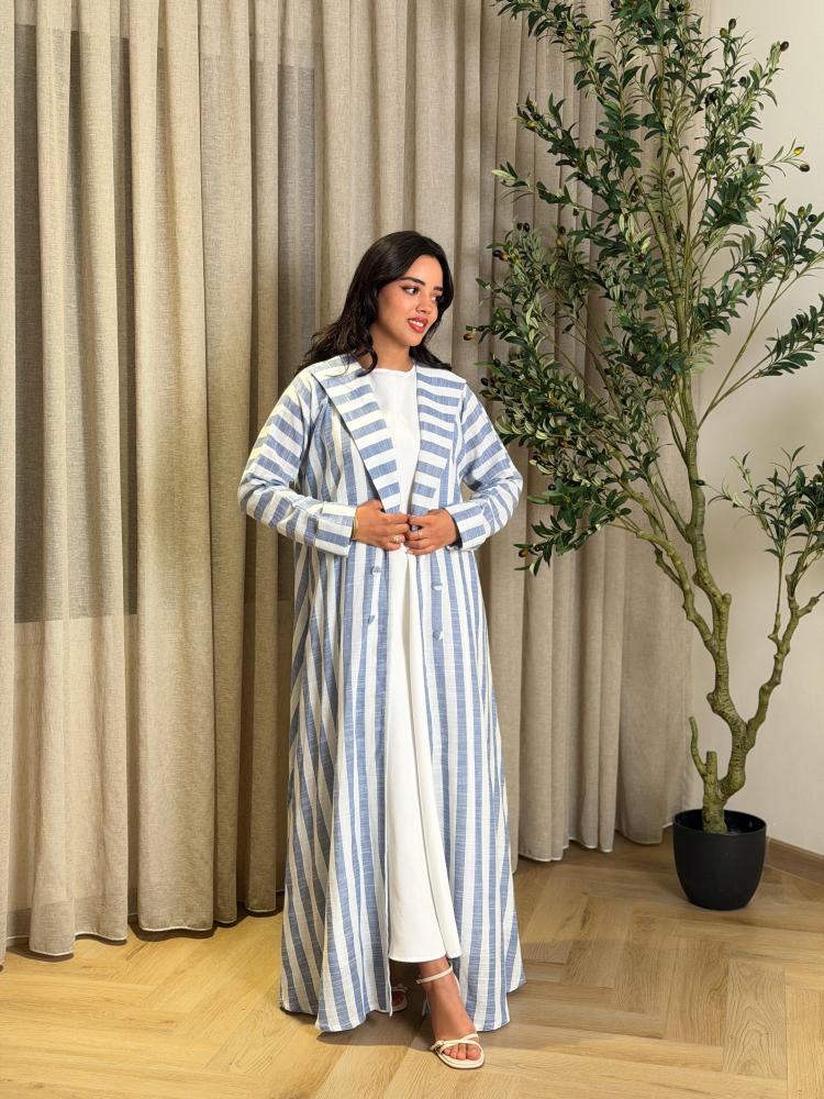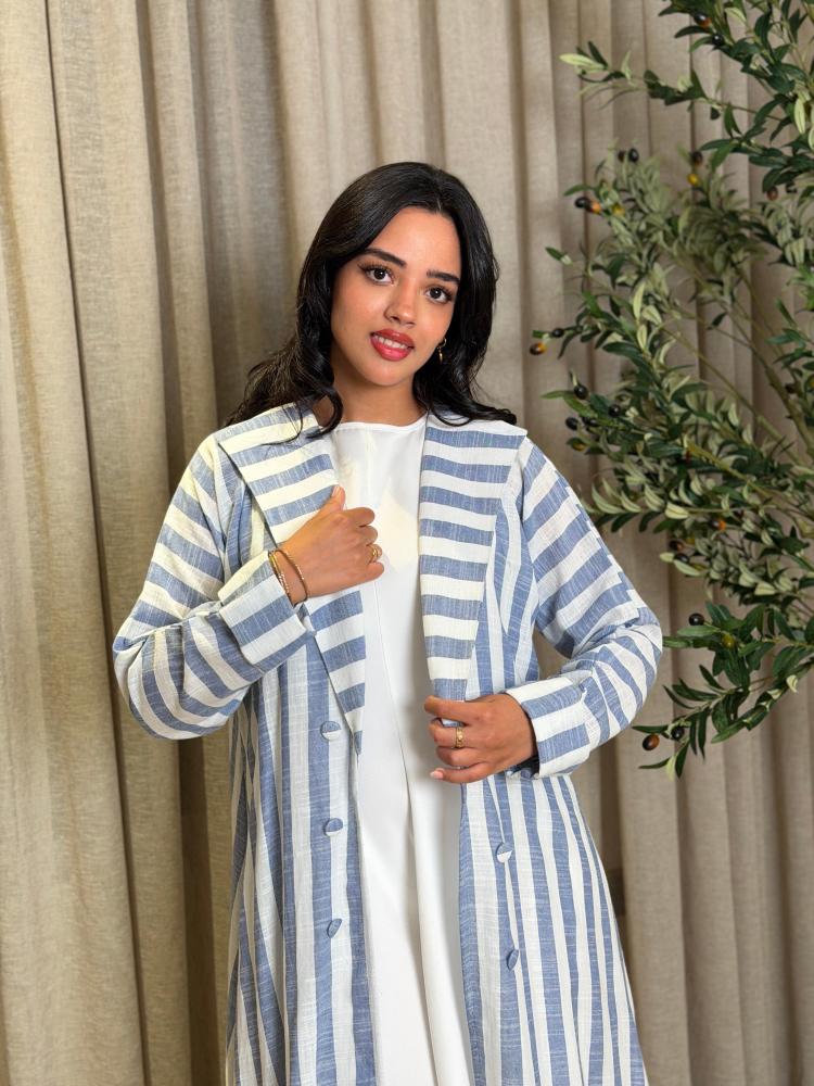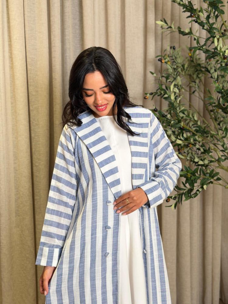 قماش لينن هندي مخطط | القصة بليزر | أزرار مغطاة من نفس القماش | طرحة ليزر أزرق